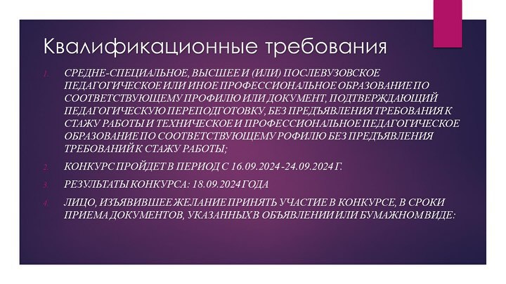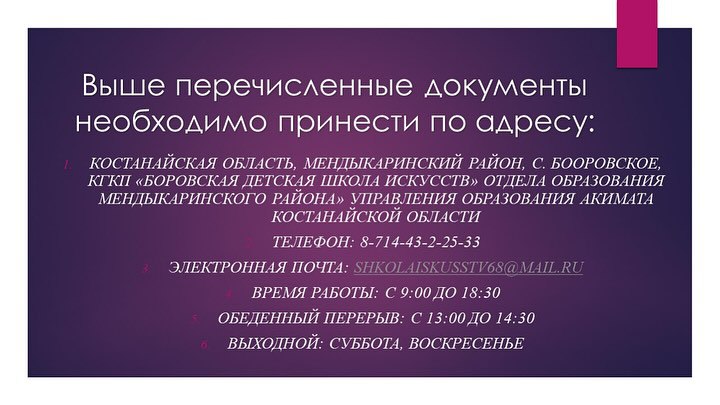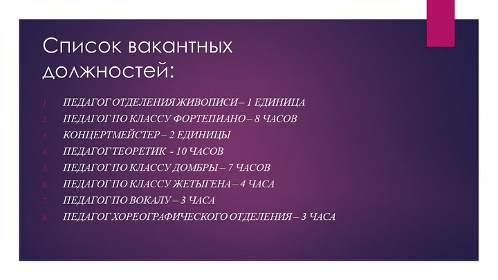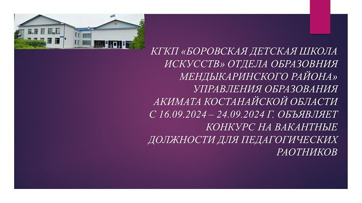 КГКП «Боровская детская школа искусств» отдела образования Мендыкаринского района управления образования акимата Костанайской области объявляет конкурс на замещение вакантных должностей педагогических работников.